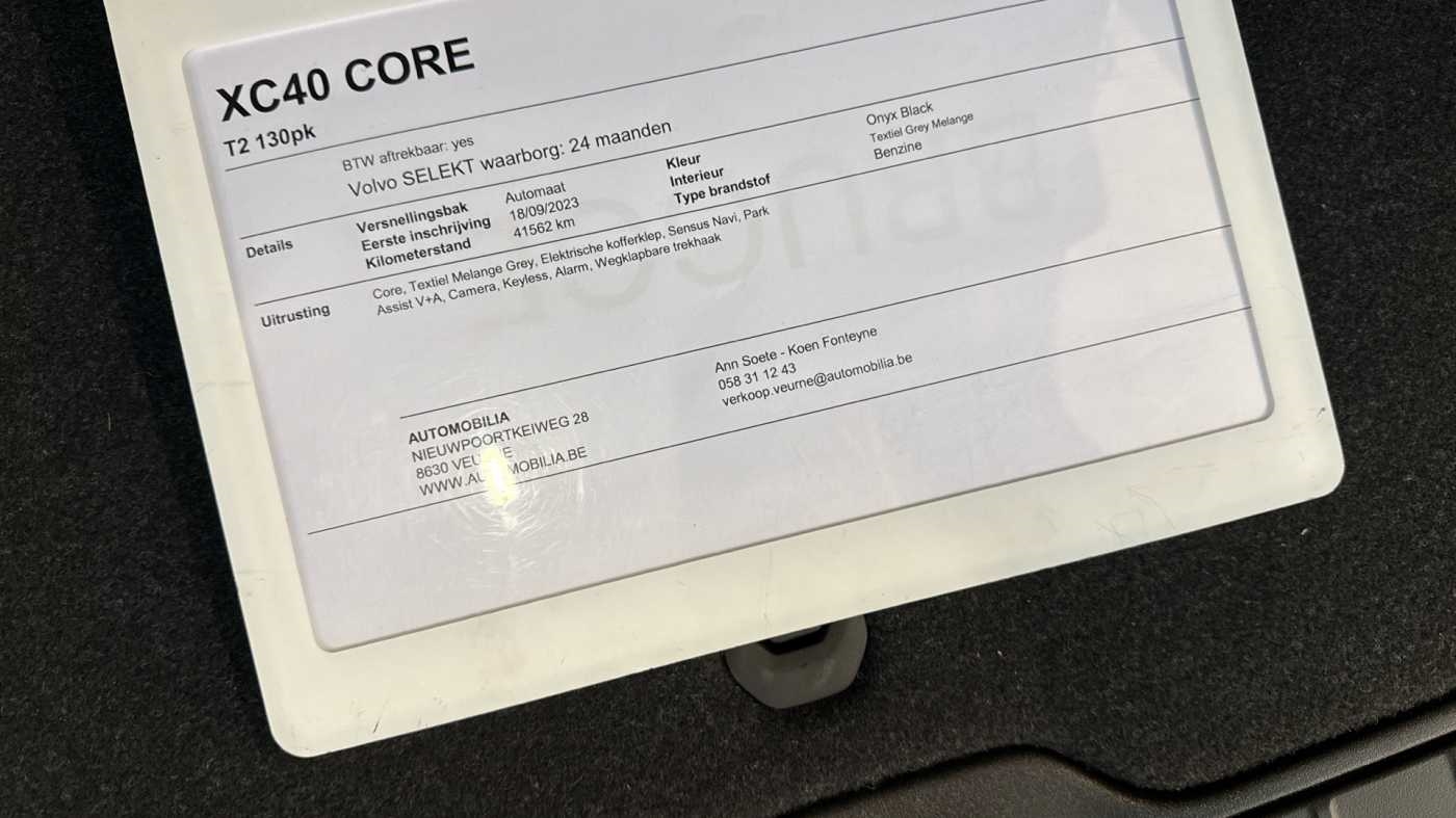Core T2 Aut | Elektrische kofferklep | Trekhaak | Getinte ramenSystème d’alarme Volvo Guard, Vitres arrière surteintées, Support d'extincteur, Crochet d’attelage rétractable à commande semi-automatique. avec prise à 13 broches (système Trailer Stability Assist compris)Revêtement Charcoal du ciel de toit Décor Urban Grid Aluminium Sellerie en tissu premium Volant sport gainé de simili-cuir Drive M ...